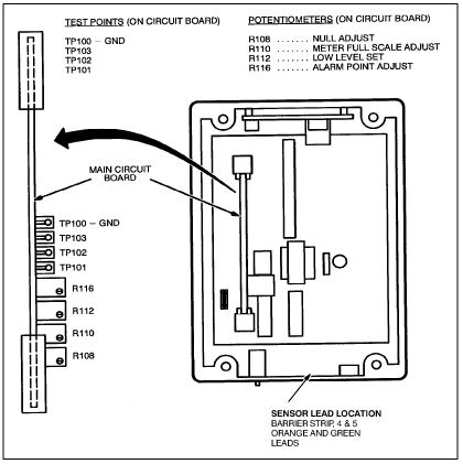 Adjust the potentiometer on the front cover of the Control Unit until the meter reads 18.0%. If the red alarm LEDs on the Control Unit and Remote Sensor Module start blinking before the meter reads 18.0%, the Alarm Set Point is set too high. To lower the set point: