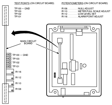 Adjust the Meter Full Scale Adjustment potentiometer R110 until the meter on the front cover of the Control Unit reads full scale (26%). Clockwise increases the meter reading, counterclockwise decreases the meter reading. See Figure 38.