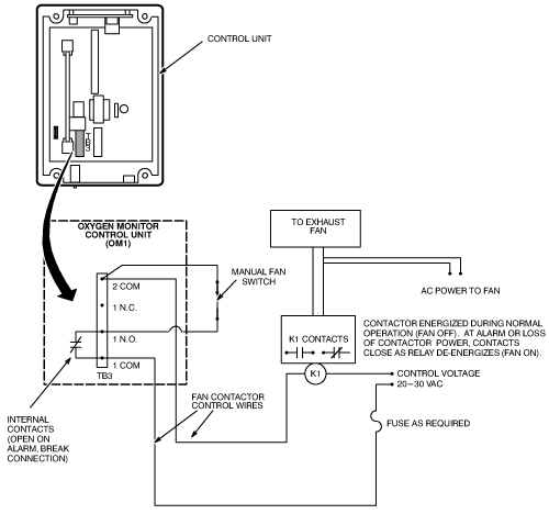 Two relays are available in the Control Unit which can be used to automatically activate customer-provided equipment, such as an exhaust fan, when the Oxygen Monitor subsystem enters an alarm state. The relay contacts are dry, with a rating of 2 amps continuous, 5 amps surge, at 120 VAC. One of the relays is a latching relay, the other is a non-latching relay.