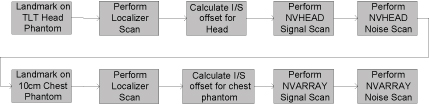 Use the following procedures to acquire the sagittal localizer, axial signal, and axial noise images. Complete this procedure TWICE: once for NVHEAD mode and once for NVARRAY mode. The procedures for NVHEAD and NVARRAY are nearly identical, with any differences noted in the procedures and protocols listed below. Perform the procedures in the order shown in Procedure Flowchart – Figure 2.