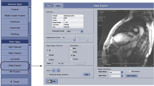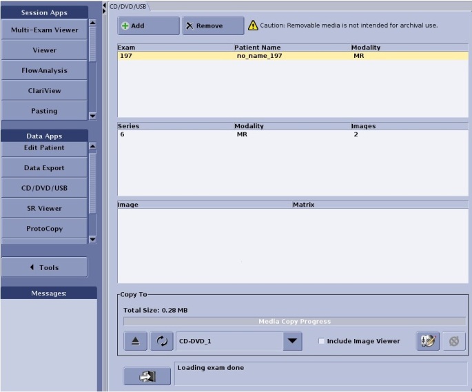 Data Export allows you to either store or ftp MR images as JPEG, PNG, AVI, MPEG or MOV formats. The files cannot only be burned to a CD-R but can be copied into a USB drive and only one report can be burned at a time. Once a CD-R has been burned, you cannot add more reports. In other words, it is a burn once process and not a re-writable process.