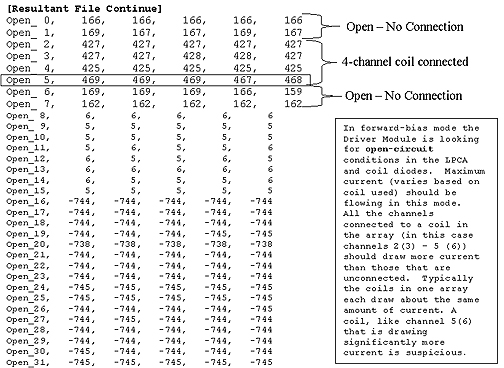 Epilogue: FE ran Gather Load Data test again, this time without any coil connected to the LPCA. No short-circuit condition was seen on channel 5 (6). Channels 0 (1) - 7 (8) all looked about the same. The LPCA electronics and everything else in the Multicoil TR biasing path appeared to be in good working order. The coil had a shorted channel 6. Replacing the coil fixed the problem. The same process of troubleshooting is used for troubleshooting open-circuit conditions except that now we would expect to see obvious problems in the Open_Section of the result file and perhaps less obvious signs of trouble in the Short_Section.