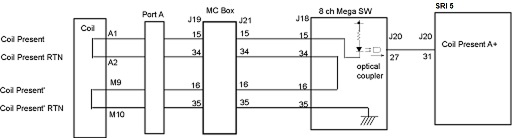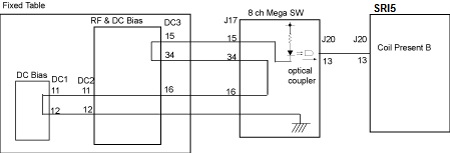 Coil ID and Coil Present pins exist in the Fixed Table connecting to the Express Coil Posterior Array. The SRI5 detects a coil connection through the SRI5 J20 to Mega J20 link from the 8ch Mega Switch by sensing Port B Coil Present signal.