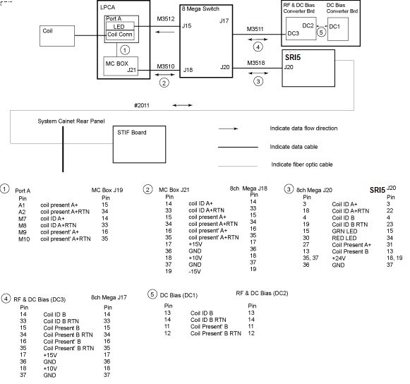 Coil ID and Coil Present pins exist in Port A+ in the Low Profile Carriage Assembly (LPCA). The SRI5 detects a coil connection through the SRI5 J20 to Mega J20 link from the 8ch Mega Switch by sensing a change in Port A+ Coil Present signal. The 8ch Mega Switch, in turn, checks the Port A+ for this Coil ID data. See the pin out information for the various connectors on the downside of the drawing. The 8ch Mega Switch makes this check through the Mega J18 to MC Box J21 link. The SRI5 receives information from the Host through the Run 2011 fiber optic links that is used to determine if the supplied Coil ID code matches that of any of the known coils. If a match is made then the SRI5 will command the LED in the LPCA to turn green through the SRI5 J20 to Mega J20 and Mega J15 to Port A+ LED links. Clinical scanning will then be permitted as long as the Coil ID code of the attached coil matches that of a known coil and the Coil ID code of the attached coil matches that of the coil selected in the prescription. If the Coil ID code returned to the SRI5 cannot be matched to a known coil or no Coil ID code is returned then the SRI5 commands the LED in the LPCA to turn red through the SRI5 J20 to Mega J20 and Mega J15 to Port A+ LED links.