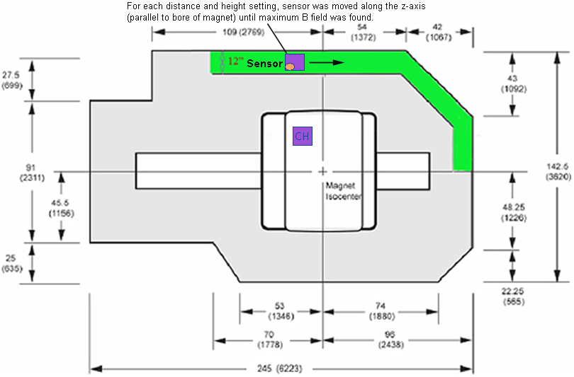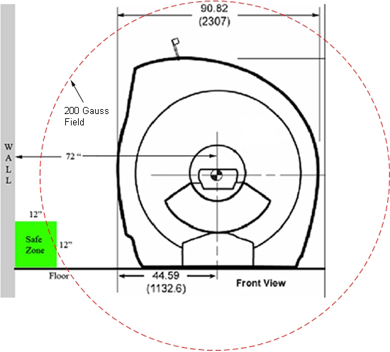 The above illustration shows an example of the 200 Gauss or greater field for a 3.0T LCC magnet. It is important to stay outside of this field by moving the object along the corner of the floor and wall. For 1.5T LCC magnets, you may use the same illustration. Although the illustration is from a 3.0T magnet, the numbers are valid for a 1.5T magnet.