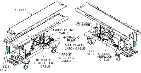Most replacement procedures covering components of the patient transport require the removal of the transport side covers. Refer to Patient Transport Side Cover Removal. Some replacement procedures also require the removal of the cradle. Refer to Cradle Assembly Removal. See Figure 1 for location of major components of the patient transport.