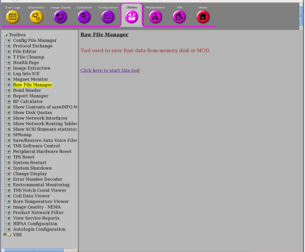 The Raw File Manager tool allows transfer of raw data files between AP (Array Processor) Memory, and the Image (system). It can determine the last raw data file run number, as well as disk e.g., locked) raw data file housekeeping ("Rebuild File(s) on Disk"). It also provides for manually perming/locking raw files.