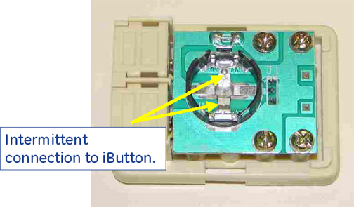 2. Verify that there is a good connection between iButton and holder (no intermittent or shorted connections). Examples of intermittent and shorted connections are shown in Figure 9 and Figure 10.