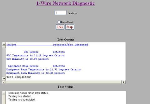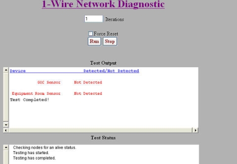 2. The 1-Wire Diagnostic checks to see if all of the 1-Wire devices in the network are connected (GOC and EQUIP). The diagnostic also outputs temperature and humidity values for the GOC and Equipment Room Sensor. All 1-Wire devices detected by the 1-Wire Network Diagnostic display in blue text in the Test Output area (see Figure 6). 1-Wire devices which are not detected display in red text (see Figure 7).