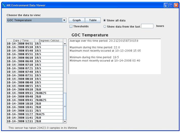 4. View the output similar to the one shown in Figure 12. From the dropdown under "Choose data to view" you can select GOC temperature, GOC humidity, Equipment Room Temperature, or Equipment Room Humidity. Date and time are also displayed.