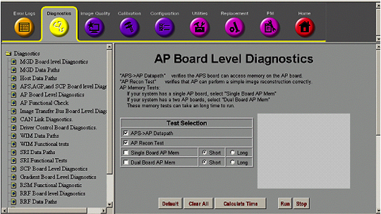 These tests check the functionality of the AP Board(s). The AP Recon test reconstructs “canned” data from a file on the system. The data is not image data and so no image will be displayed after the reconstruction completes. See Figure 14. Notice that the tests are explained in the top of the screen. Refer to Table 9 for test descriptions.