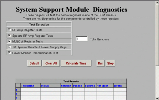 These diagnostics check various functions and registers on the CPD Board inside the SSM. These tests do not check hardware external to the SSM. Be aware that all multicoil functions are now controlled by the Driver Module. The system still writes to the SSM Multicoil Register and so this diagnostic is still provided. See Figure 15 below.