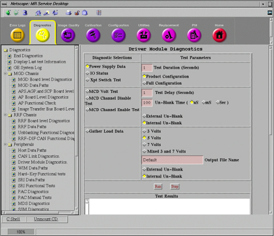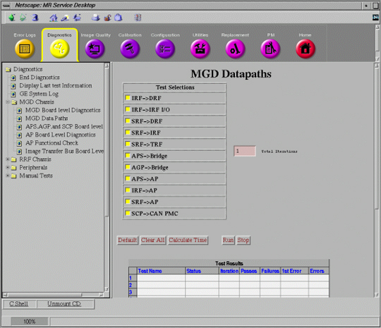 Refer to Figure 2. These diagnostics allow the testing of the communication paths between various boards in the MGD Chassis. Data paths diagnostics are tests, which transfer data from one FRU to another for the purpose of validating the hardware. This is accomplished where possible by utilizing the application code in a similar manner, as it would be used for patient scanning. This serves two purposes. The first is to detect the same errors as the application code does. The added advantage here is the canned data, which can be validated once it reaches its destination. The second advantage is the ability to validate the software as well as the hardware. The intensity at which the diagnostic works can speed up the detection of timing related problems. Test Results and Test Status are reported at the bottom of the window. Refer to Table 2 for test descriptions.