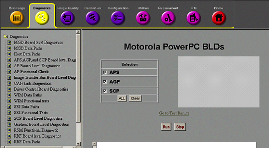 Refer to Figure 4. These diagnostics allow individual testing of the AGP, APS, and SCP Boards. Options can be selected from the right side of the window as described earlier. Refer to Table 4 for test descriptions.