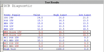 Figure 8 provides a display of what results should be seen when running this in Full Configuration. Full Configuration tests all parts of the Driver Module, including those parts not yet used. Notice the failing items displayed in red (NEG Drive 15V, POS Drive 12V, MC2 POS 10V, and MC2 NEG 10V). Also notice that while the High Volt parameter is colored blue, the Value number is very low. This is due to the fact that the limits are set very wide. Obviously, the High Volt parameter is for future use. Since none of the functions indicated by the failing red parameters are currently performed by the Driver Module, it is normal and expected to see these failures.
