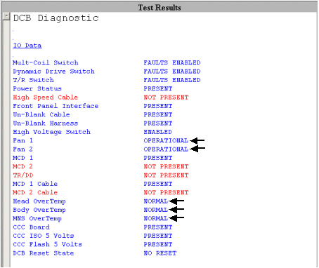 Figure 9 provides an example display of what should be seen when running this diagnostic in Full Configuration. Notice the failing items displayed in red (High Speed Cable, MCD 2, TR/DD, and MCD 2 Cable). Again, these failures are normal in Full Configuration since these functions are for future use. Note the items in the Test Results window marked with an arrow. These items are detected on the Driver Module TR/DD Board. Since Driver Modules in systems with an SSM do not have a TR/DD Board (the SSM performs these functions), the status of these parameters is not valid. A failure of Fan 1 or Fan 2 on the front of a Driver Module without a TR/DD Board will not result in a change in the Fan 1 or Fan 2 parameter. The operation of these fans should be confirmed by visual inspection. The Head, Body, and MNS Overtemp parameters are determined from the temperature of the driver transistors on the Driver Module TR/DD Board. Again, if the system has an SSM, then the Driver Module will not have a TR/DD Board and these values are therefore not valid. Finally, be aware that if the CAN Communication Core (CCC) Board fails then a message indicating that the CAN Link has failed will be displayed in the Test Results window instead of the IO Data.