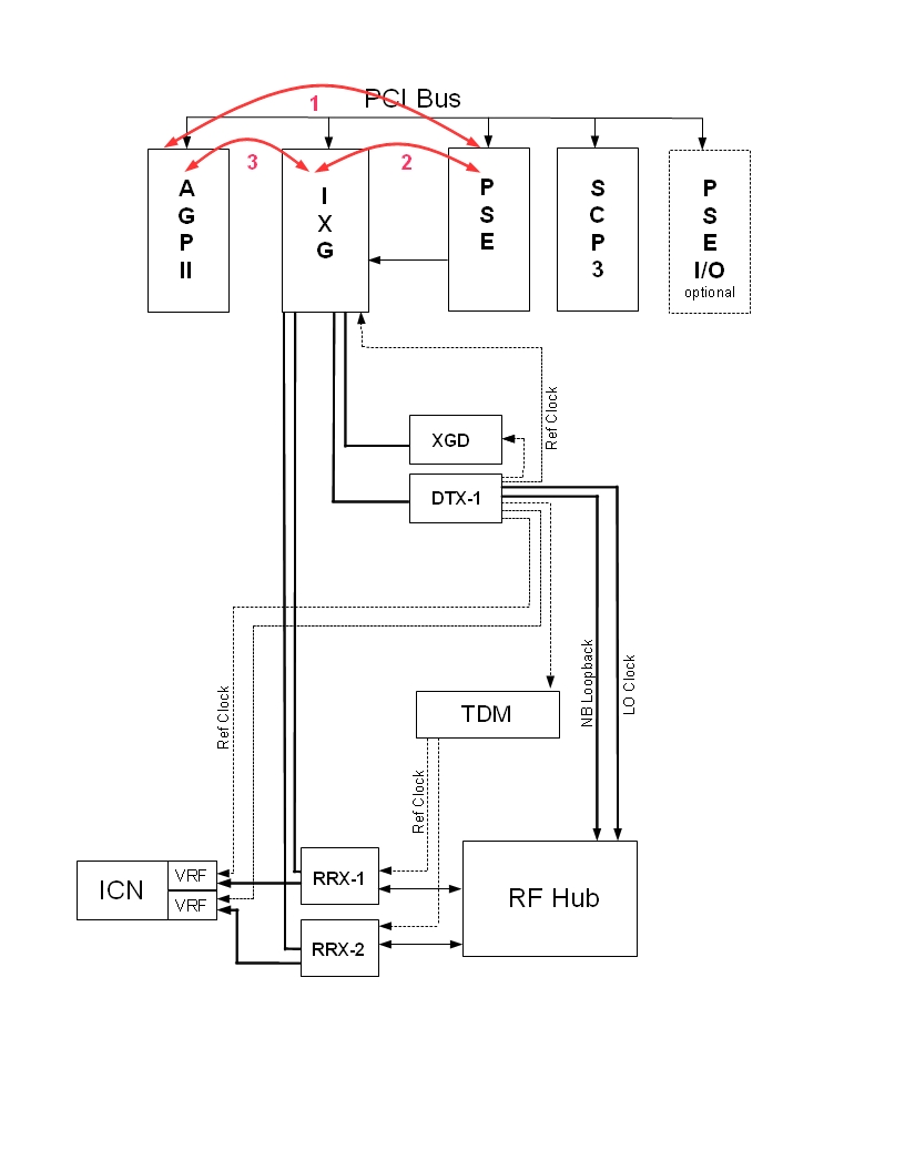 If the system has the MNS option installed, the PCI bus may include an ERF board. In this configuration, RRX-1 and RRX-2 connect through the ERF board instead of the IXG board. The data acquisition for this diagnostic test performs the same for all configurations.