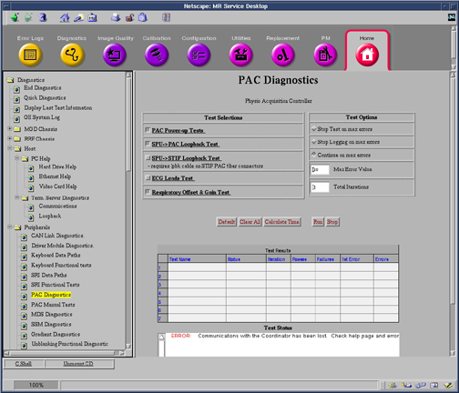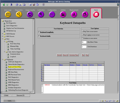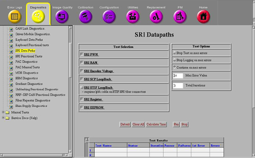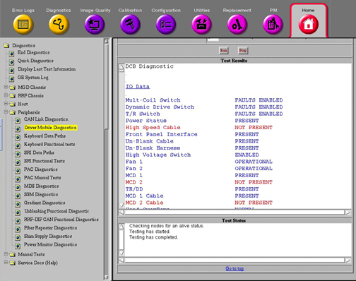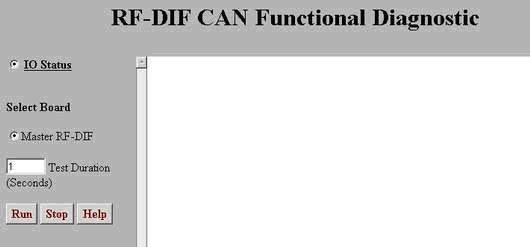This diagnostic reads the I/O Bit map information from the DCB board every 5 seconds for the specified Test Duration (max 300 secs). Each polled item and its status is printed in the window. Status messages displayed in red indicate an abnormal condition. See sample screen and comments in Diagnostic Tests and descriptions in the table below. |