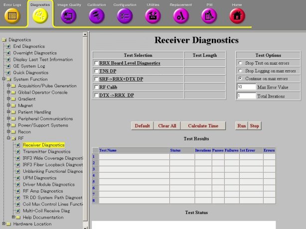 There are one RRX modules attached to the side of the magnet. The RRX Board Level Diagnostics test each RRX module installed and the dual fiber link between the RRX and the IRF3. It also tests the circuitry internal to each RRX module. The test is run from the AGP. This diagnostic creates a log file in the directory /usr/g/service/log for each RRX tested. These log files contain he results of the RRX signal quality tests.