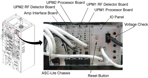 Connections to input power and CAN communication. ON/OFF switch for entire ASC-Lite Chassis. Reset Button will reset both UPMs; however, any measured RF power from the scanner is NOT reset. Voltage banana jacks are for checks of the power supply.