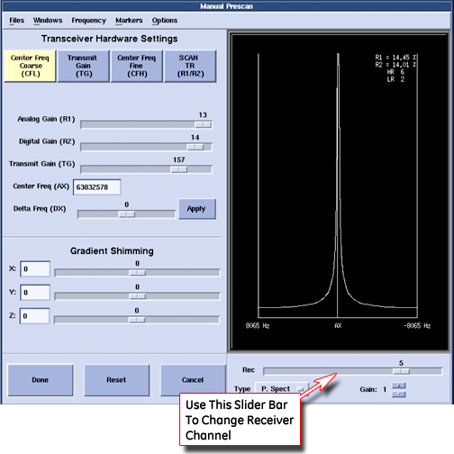 Selecting the [Manual Prescan] button in the Scan View will bring up the Manual Prescan window and begin data collection and display in CFL (Center Frequency Coarse) mode. As shown in Figure 2, the "Rec" slider bar determines which channel is displayed in the data window. Data from all six channels may be viewed one at a time.