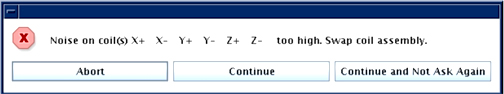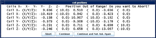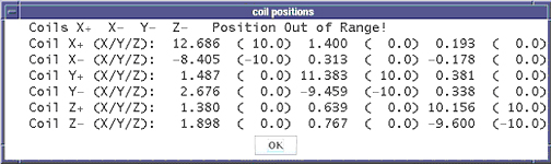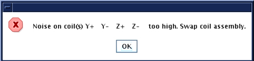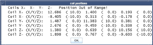 If any of the samples are greater than 1.5cm from their ideal location in the bore, an error will be presented along with the measured X, Y and Z coordinates of the coil pair. For example, the +Y (upper) coil has an ideal location of (0, 10, 0). The actions depend on the direction of the error. Note that for the LCC magnet, when facing the bore at the patient end of the magnet, +X is left, +Y is up, and +Z is toward the LPCA.