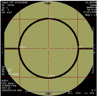- Adjust Window (W) and Level (L) settings until the edges of the phantom image can be clearly seen.