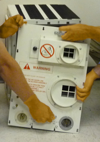 To ensure a safe distance, make sure that the clear path through which you will be moving the blower box is completely outside the 200G line. The distance to the 200G line can be found in the Pre Installation Manual (PIM). (To open the PIM, from the Service Methods media navigate to the “Pre Installation” section and select the PIM corresponding to the system on which you are working. Gauss plots can be found in the section titled “MR Suite Minimum Room Size Requirements”).