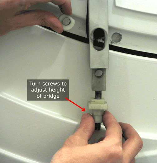 note:If reusing this bridge, do not change the location of the height adjustment for the threaded nylon nuts. If replacing this bridge with a new bridge, adjust the lower nuts so the edges of the bridge adjacent to the end bell are flush to 1 mm below the flat surfaces of the end bell.