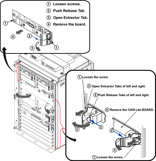 - Push release tabs (1 or 2 according to the board) in the lever, and gently pull the extractor tab(s) of the circuit board.