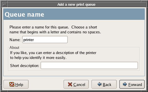 - At the Queue name screen, type a name for the printer (shown