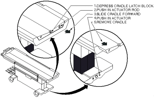 - Press cradle latch block at front end of transport with a blunt object (such as a pencil eraser), and simultaneously push in actuator rod at front of cradle (see Figure 1)