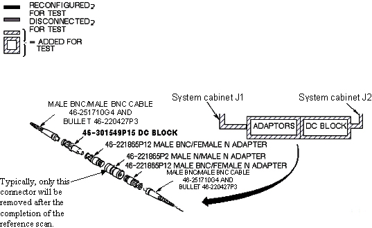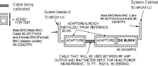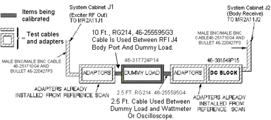 - Test cables long enough to reach the cables, connectors and dummy load to be tested are connected between the Exciter RF Output (System Cabinet J1) and Receiver Body Input (System Cabinet J2). Receiver gains (R1 & R2) and transmit gain (TG) are set for near full scale reading on the power spectrum during prescan calibration. A reference scan is taken and stored in a raw file. The Attenuation Test Tool is used to calculate the baseline factor from the reference scan for the test cables (i.e., there is some loss from the test cables).