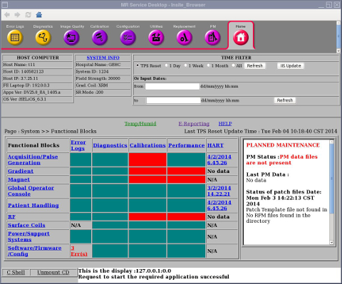 The reports can be viewed in the tool, and can be exported to media such as DVD, CD, or USB drive. Each service report includes the hospital name, system ID, system name, and the date it was generated. Service reports for the last three years are maintained on the system. Reports older than three years are automatically deleted.