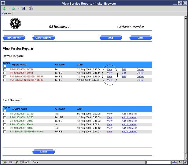 - A list of unread reports is shown at the top of the page, and a list of read reports is shown at the bottom of the page. When a service engineer creates a report, it goes to the Unread Reports list. When a customer opens the report, it moves to the Read Reports list.