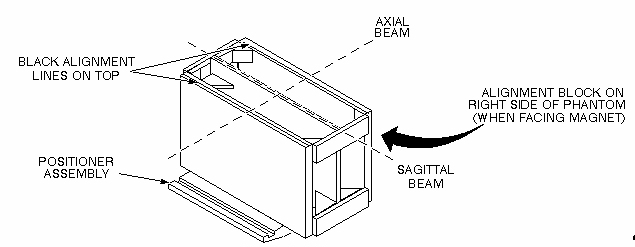 - Place the FFD phantom on the positioner assembly and center it on the table with plates oriented vertically (black alignment line on top) and the alignment block on the right side of the phantom (as you face the magnet). The side of the phantom with the alignment lines should face up. Landmark (axial) on the middle vertical tube of the center plate.
