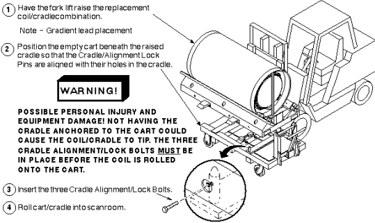 After having the fork lift truck remove the failed coil and cradle from the cart, the replacement body coil, on its cradle, must be loaded and taken to the scan room.