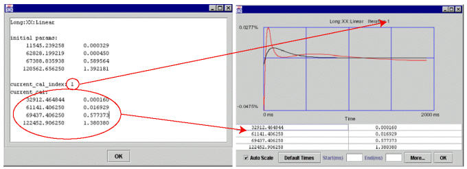 Initial cal values (initial parameters) of the component (long xx linear in this example) (the cal values of the component when Grafidy 3 was invoked). See Selecting Previous Interations for more information.