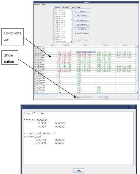 In the matrix summary view, there is column between the component label and first iteration labeled Conditions. If the Show button is chosen with one of these matrix cells selected, a message displays summarizing the initial and current calibration state of the associated component. Unlike the cells in the iteration columns, this information can be shown even if data has not yet been collected for the component.