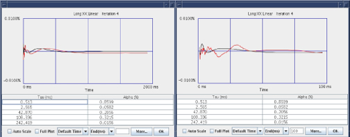 - [End (ms)] pull down - The [End (ms)] pull down list, and the text box next to it, let you define the minimum and maximum axis display limits for both the vertical and horizontal axes. Select the desired entry from the list and enter the value in the text box to update the display. The image below shows an example of the appearance of a data curve before and after setting the end time of the horizontal axis to 100ms.