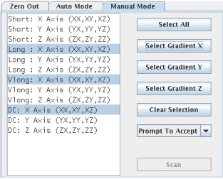 The Manual Mode tab is provided to allow individual components to be calibrated. In manual mode, all of the signal checks are performed, but since the scan has already completed, an option to abort is not presented if an error is found. In addition, unlike in Auto mode, there is not a way to turn the checking off. Due to the fact that signal from all six samples is collected and therefore all four components are available, only the selection of an entire mode is available for selection. That is, you may select the long mode pulsing the Z-axis, but not the long ZX component.