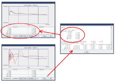 In the example image above, fitting data collected in the third iteration generated the circled calibration values. When accepted (as was the case here), these calibration values went into the calibration file (grafidy.cal) as well as the associated files that are downloaded to the hardware (grad_ecc_coeff.dat and b0_ecc_coeff.dat). These values were then used in the next (fourth) iteration. To verify this, the More button was selected when displaying the data from the fourth iteration. The calibration values used to collect the data are listed under “previous parameters”. As shown here, the value of “previous cal index” is 3 showing that the calibration values used were generated by the 3rd iteration and the values are the same as the values listed as the best-fit parameters in the 3rd iteration data display.