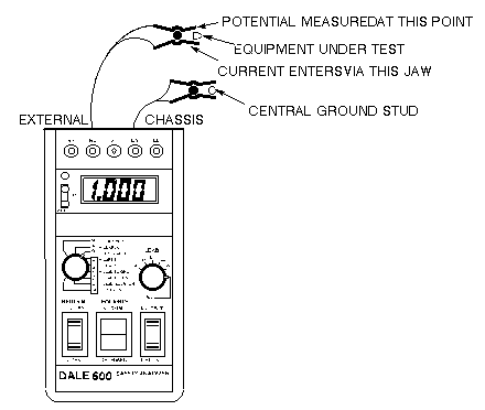 - Connect one clamp-type lead to the EXTERNAL jack on the top of the Dale safety analyzer. Connect the other clamp-type