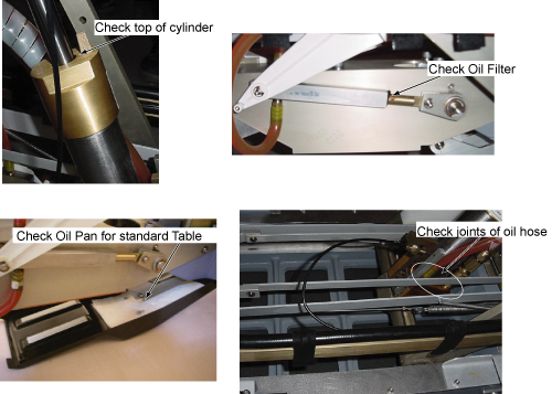 - Raise table with several pumps on the Up foot pedal and check for oil leaks. If leaks occur, tighten connections snugly, but do not over tighten; brass fittings will deform if over tightened.
