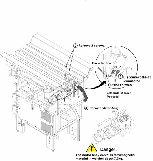 The Longitudinal Drive is located in the rear pedestal. Two people are required to replace the Longitudinal Drive Motor due to the its strong attraction to the magnet.