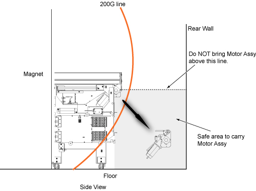 - With two people holding the motor assembly, exit the magnet room by walking as close to the wall on the coldhead side of the magnet as possible.