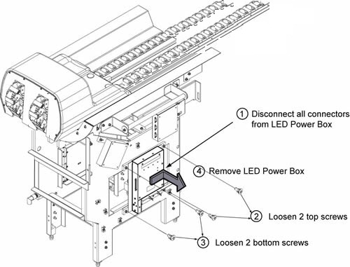 - Loosen 2 top screws fixing LED Power Box.
