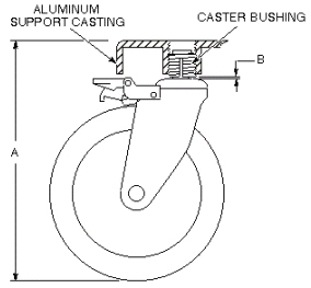 - Using a means of leverage, slightly prop up aluminum support casting at caster being adjusted only enough to take Patient Transport weight off caster wheel. This will disengage caster shaft from caster bushing and prevent excessive wear on threads during adjustment.
