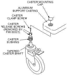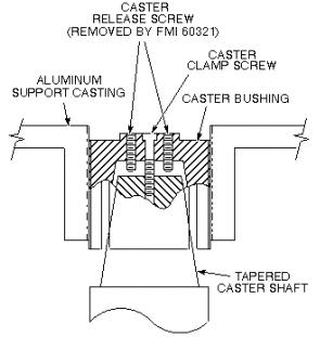 - To avoid the condition caused by leaving the caster release screws in too far, FMI 60321 eliminates the caster release screws from the caster assembly hardware (also currently being removed from all forward production Patient Transports). When it becomes necessary to force the tapered caster shaft out of the caster bushing during an adjustment procedure, two caster clamp screws will be used in the vacant caster release screw holes. One of the caster clamp screws will come from the caster being adjusted, and one will be borrowed from another caster assembly.