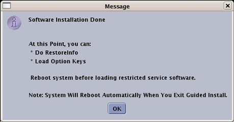 note:If restoration fails, the DVD automatically ejects the media. Exit the Guided Install and allow the system to reboot. When the system restarts, return to the Guided Install and attempt to Restore Info again.